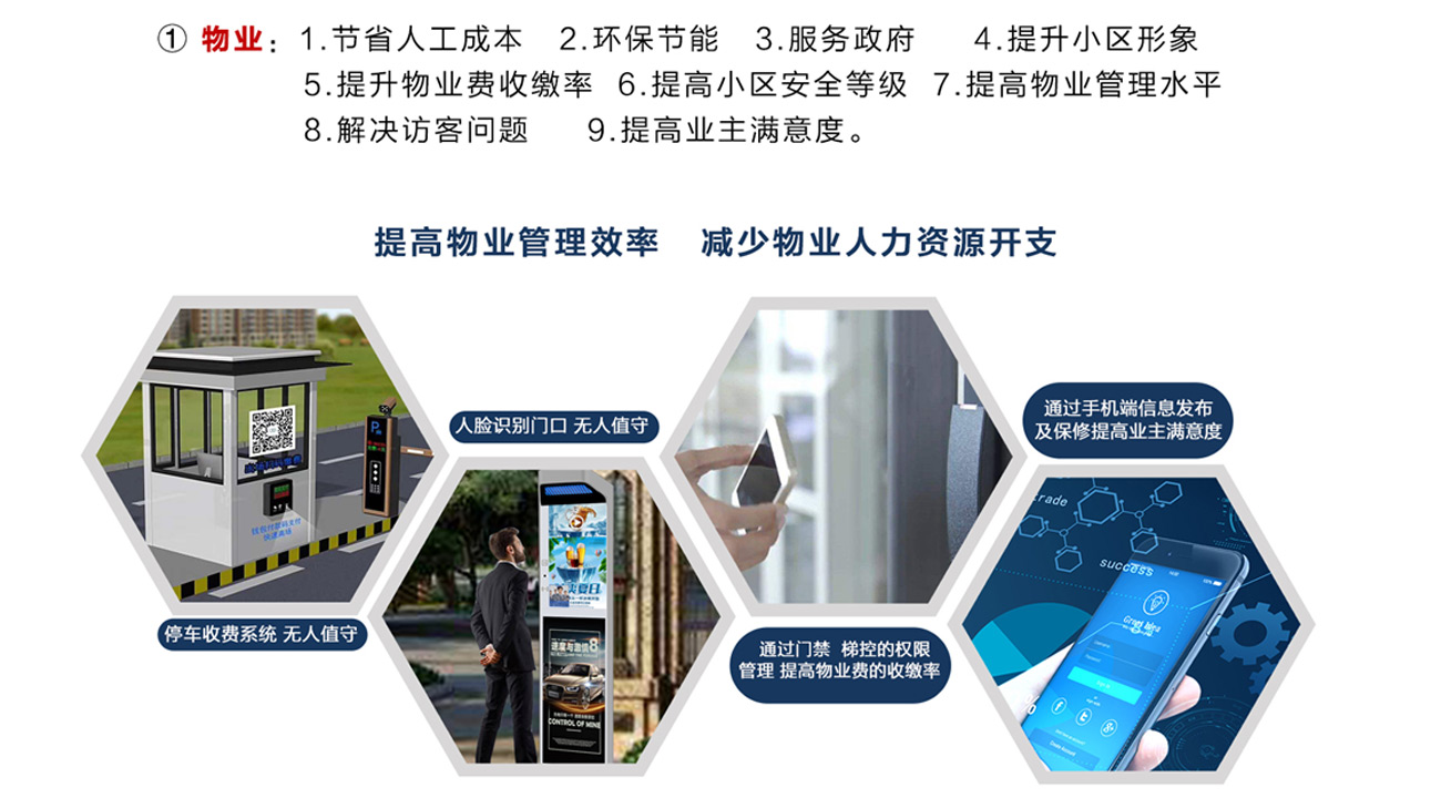 利用物联网和移动互联网技术,对小区门禁、停车管理、电梯管理、社区安防及家居智能化等进行高度整合及统一平台,提供高质量的物业和社区O2O服务。